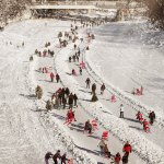 The installation is composed of fifty recycled chairs and fifty pairs of recycled skis that are fastened together using metal connectors. Each unit is painted neon-pink and stenciled with a unique word along its back. Diffused across the length of the Red River Mutual Trail, Recycling Words creates a visual explosion and recognizable marker for the various access points of the Assiniboine and Red rivers.