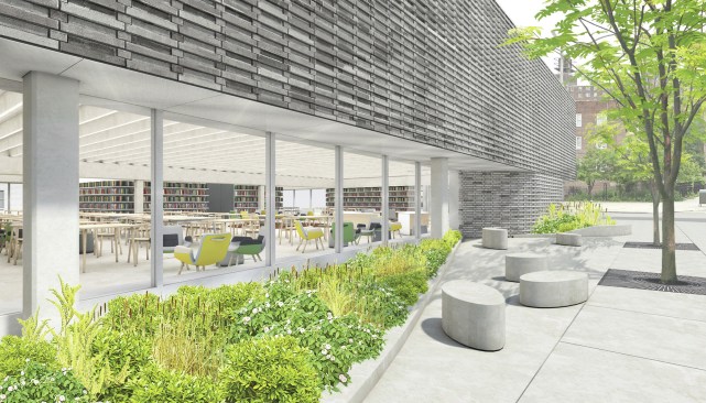 Given the library’s location in the floodplain, the project incorporates resilient design by integrating flood mitigation strategies in both the architecture and the landscape. The green outdoor spaces include a bioswale garden and shaded areas for classrooms and experiential learning. At the new entrance, existing gates are removed and seating is added to create a more open and welcoming library presence. Altogether, the Red Hook Library will become a source of community pride and inspiration.