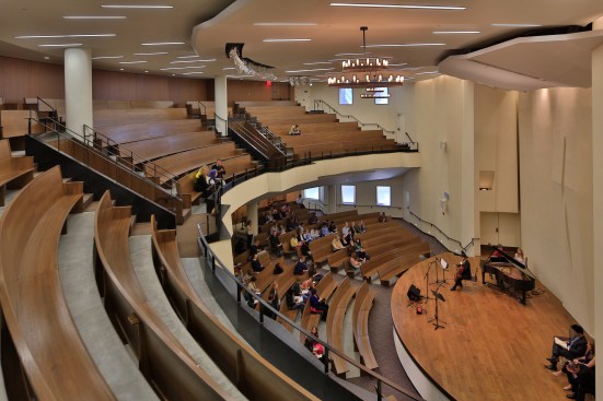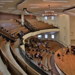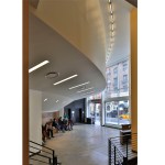 Beyond the entrance, which doubles as a café, is the Sanctuary seating 870 congregants. This is the quiet core of the church – an ethereal space. It is in the simple form of a Greek amphitheater, and is buried into the existing building. As daylight is limited, the design concept focuses on the controlled play of artificial light on a complex pattern of folded plaster planes rendered in various white and off-white textures. These wall and ceiling surfaces envelop the fan shaped form, which is emphasized by curved pews in warm rift-cut oak.