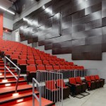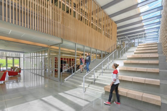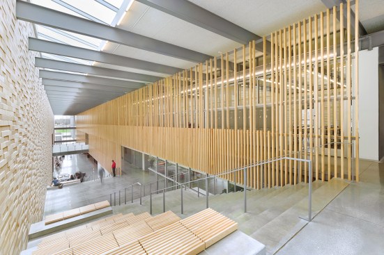 Softening the environment still further is a wall that runs the length of the central skylit atrium: Composed of differing depths of buff-toned bricks, the textured surface catches the light and brightens the communal space. The wall is complemented on the opposite side of the interior hallways by a double-height wooden screen that also acts as a railing for the upper-level gallery. The light-filled concourse does double duty, as the designers have embedded seating (also in wood) into a staircase that ascends to make an active social space—a bonus amenity for students and teachers alike.