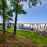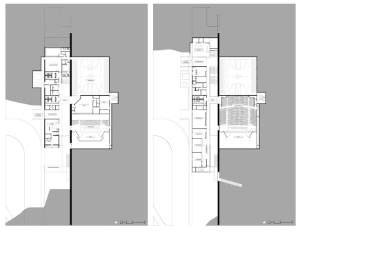 In order to preserve the natural environment, the solution eschews the obvious choice to build on the flattest part of the site. This approach reserves precious buildable sites for future athletic fields and buildings while providing storm safety for the entire campus. The choice of site makes use of a large existing surface parking area, minimizing the need for additional parking. Responding to the rugged terrain and natural site conditions, the building is organized into four key elements: ‘the school box,’ ‘the stream,’ ‘the bluff,’ and ‘the den.’