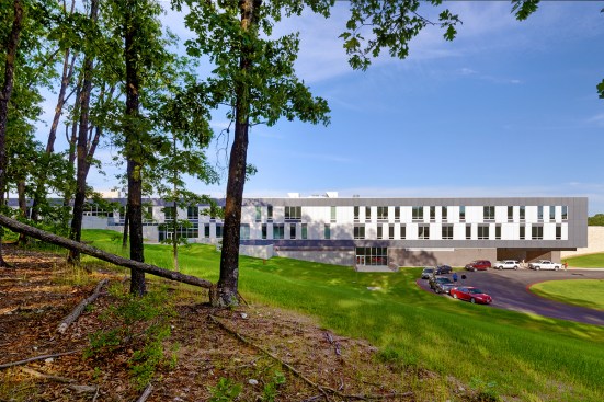 A massive masonry wall retains earth and provides the resilient construction needed for safety, much like the rock bluffs abundant in the Ozarks. Two large gathering spaces – a competition gym and a 1,000 seat auditorium – are nestled into an existing hollow like wolf dens with a turf green roof providing storm safety for the campus. The result is a scheme that celebrates the rugged beauty of the site, with large gathering spaces below grade providing storm safety, and classrooms among the trees.