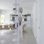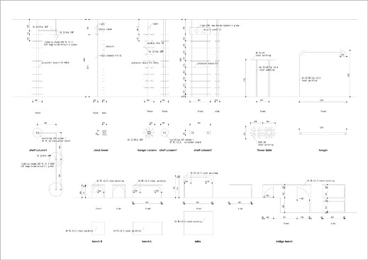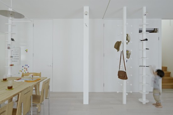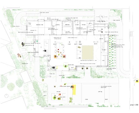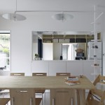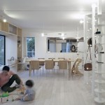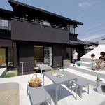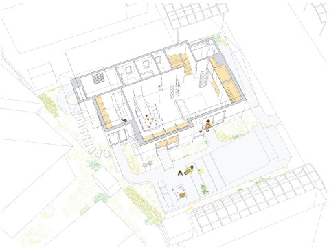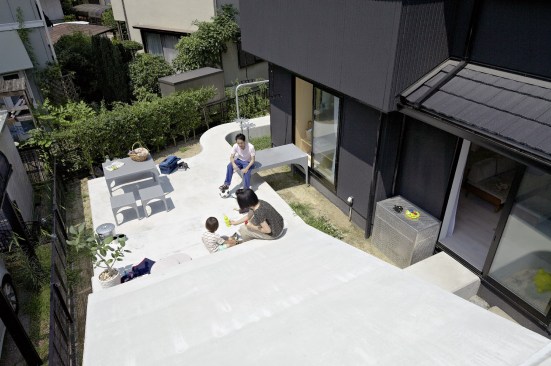 The extra height of the raised platform and paths makes it easier for the residents to interact with their neighbors over the low fences of the surrounding plots. Furnishing the patio are custom-designed tables and benches that are fabricated from steel plates and provide an outdoor seating area and play space for the children; one long, rectangular table bridges the gap between the platform and sliding glass doors in the dining area in the open-plan first floor of the residence, allowing for easy surveillance of the children and an indoor/outdoor dining experience.