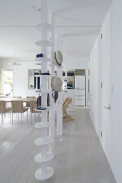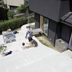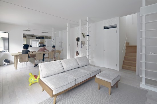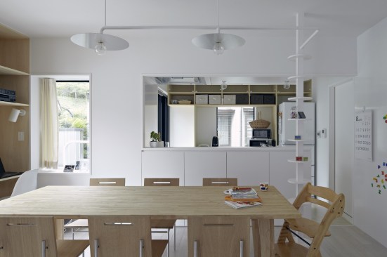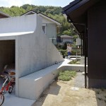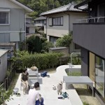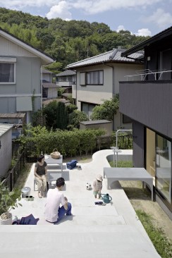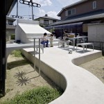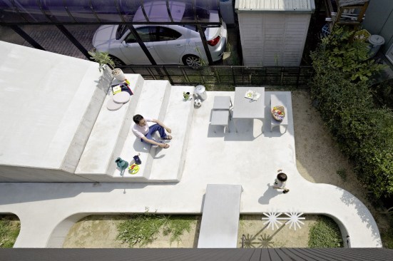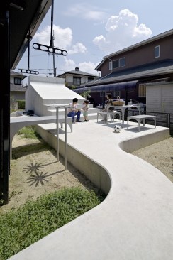 The concrete structure also allowed Kagawa and Kishigami to walk the line between privacy and openness. The height of the garage shields the bulk of the patio from the street, while still allowing for the desired connections to neighboring houses. But the area around the structure, at least on this plot, is largely open. Before the renovation began, “the exterior of the houses consisted of many elements, including a fence, gate, carport, bicycle parking, and plants,” Kishigami says, noting that they decided to remove some of the elements that blocked off the site “because these devices can project meaning to the city.” Now, no fences on the public face remain, and, through SpaceSpace’s design, the residents have made their message of welcome to the neighborhood quite clear.