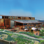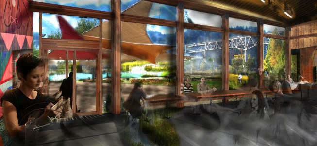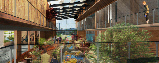 LAND USE/SITE ECOLOGY: Due to the previous destruction of riparian habitat, the building re-populates the land with native species of plant life. This utilization of local plants not only improves the riverside soil conditions, but also creates habitats for local fauna. The building is separated in order to allow for the natural ecology to pass through the building when it needs to. This creates an environment where the building can be apart of nature rather than to dominate it. The integrated urban farm also allows for the site to be used as a source of food for the building, which cuts down the necessary transportation of food goods to the site. Additionally, much of the site is geared toward community spaces and events to help bring people to the site. A large portion of the site is dedicated to the cleaning of stormwater and greywater. The treatment ponds and cisterns is a visible and interactive way for visitors to witness the water cycle.