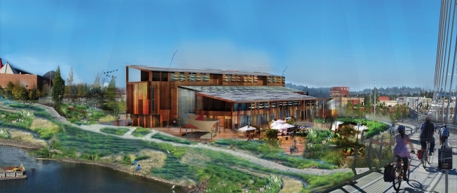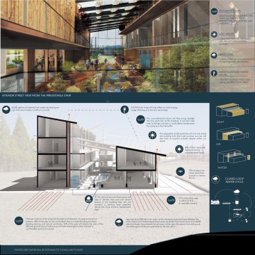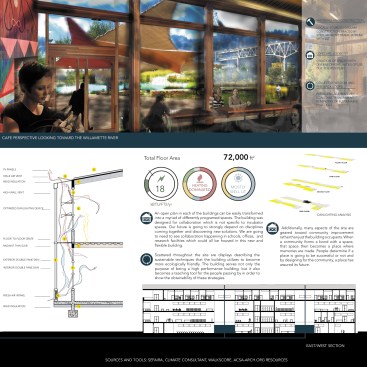 DESIGN AND INNOVATION: Having an energy efficient building has a lot to do with the decisions made during the preliminary design stage. For this building, an emphasis on a long and narrow floor plate was made to assist with daylighting and natural ventilation. Due to program demands, a decision was made to separate the program into two buildings or bars which helped to keep the floor plates between thirty and fifty feet deep. This also allowed the height of the building to remain under five stories which is the maximum building height in that area. By separating the two buildings, an indoor atrium was proposed to both help bring the outside in as well as to help act as a thermal buffer and regulate the buildings’ temperatures year round. The goal for the site was to regenerate both the immediate area as well as the surrounding industrial district. The building is to also be an icon for innovation and sustainability and can be seen from a “bird's eye” view from both the Tilikum Crossing and the I-5 Bridge. Not only is it important for the building to use regenerative design strategies, but it also needs to demonstrate to the public what regenerative design can be.