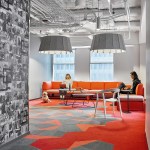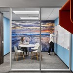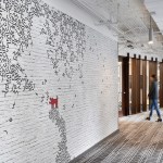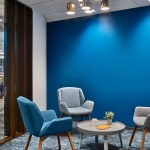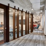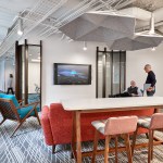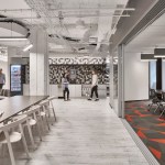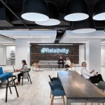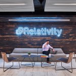Relativity, the world’s leading e-discovery company based in Chicago, currently occupies three floors in a neo-classical architectural gem located in the city’s financial district at 231 South LaSalle Street. Requiring additional space for its growth and increasing operations, the client expanded to an additional floor, 40,000 usable square feet, which came completed with half of the space previously built-out for a speculative suite. The client desired to maintain as much of the space as possible, although an aggressive plan for company growth flexibility and adaptability were very high priorities. The key driver to the expansion was to maximize Relativity’s workspace program to embrace flexibility, while also integrating and accommodating the improvements to the speculative office suite. The workstation design solution incorporates a “spine system” which allows for desks to be positioned and rotated according to the work styles of various groups. A wide variety of alternative work areas are dispersed throughout the plan including small conference areas, open team meeting spaces, phone rooms, and amenity spaces, including a zen/relaxation room. Large group collaboration areas, meeting spaces, and break rooms are positioned in curvilinear-shaped areas further highlighted with vertical wood mullions. In addition to flexible workstation space, the large open collaboration areas on both the east and west side lend themselves to large, all-hands meeting with sliding doors opening into the larger space. Integrating technology throughout the space was also crucial to Relativity’s needs. Microsoft Surface™ hubs were incorporated into all the conference rooms and collaborations spaces. Monitors are also strategically placed throughout the floor displaying floor plans, events, new hires, and general office information.