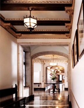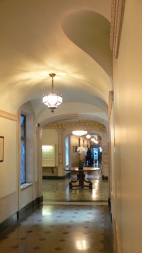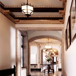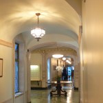 We designed brass and “hammered-glass” light fixtures after looking at fixtures of the period “in the flesh”. The design proceeded from drawings through architect’s models to working manufacturer’s mock up to ensure that the scale and functioning were right. Finally we selected and positioned new furniture to give focus to the restored spaces.
