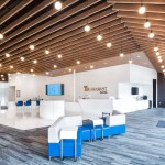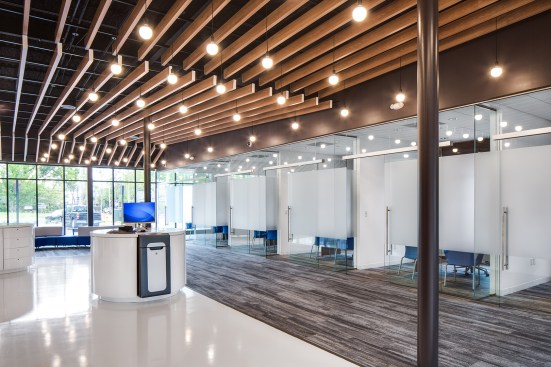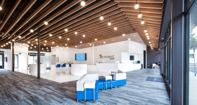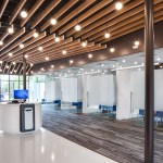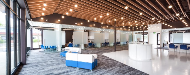 Union Avenue is dominated by retail developments with asphalt parking areas separating the building facades from the street. The design challenges this trend by bringing the building forward interrupting the ubiquitous line of parked automobiles. This urban design approach provides enhanced visibility for the retail center’s tenants, and provides pedestrian amenities along a typically car-centric corridor. Vehicular parking is provided at the north side of the building where primary entrances to each tenant are located. With the migration of many smaller services easily offered via web or mobile app, the physical bank storefront has shifted to a more personal range of priorities. The interior has been designed as multi-purpose space in order to service a variety of needs, ranging from digital banking to personal financial advice from a universal banker. Universal bankers are expected to walk their clients through every step of the process which aids in stronger customer relationships. With the changing pace of the banking process, we also developed a daily client relations strategy for universal bankers to employ. Bankers can have three steps through which to lead their clients: Engaging, Transacting and Consulting. In the Engage process the Universal banker is expected to greet clients, triage their needs and provide an interactive waiting experience. For the Transact step, the banker is able to assist the client with typical banking needs such as checking accounts, making deposits, etc. And finally in the Consult phase, the banker can assist the client with more personal services like opening or closing accounts or taking out a loan. The universal banker having the ability to act on all of these steps is crucial to the banker/client relationship. The client should only need to deal with a single person who can understand the entire context of their needs and not be passed around from person to person.
