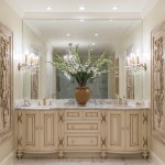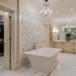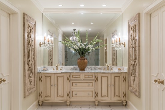 Repurposing two of the prior wall sconces and adding new life to them with adornments gave homage to the original design. A beautiful Italian chandelier that enhanced and complemented the sconces was installed. Using marble and other architectural elements to evoke one single view of the space without separate lines of vision was key. Austin chose crystal vanity knobs in conjunction with the crystals on the chandeliers and sconces to generate style balance. The walk-in shower was reconfigured to provide ample space, and its wall-to-wall glass was designed to be unobtrusive to the reflected view from the vanity wall.