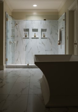 Symmetry was paramount; by aligning a new vanity on the newly formed wall and placing it directly in proportion to the new walk-in shower, the symmetry tone was set. Repositioning the existing closet door and adding another closet door to frame the new tub added more symmetry as well, and a sense of proportion to the large bath. The toilet area was lined up perfectly across from the closet doors, well hidden from the room’s focal points.