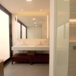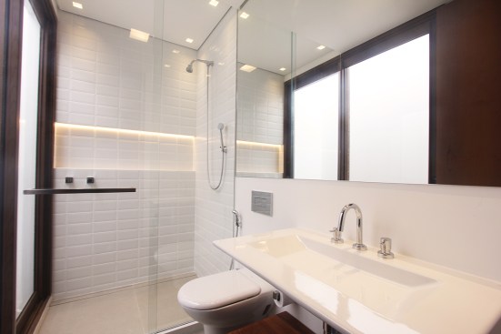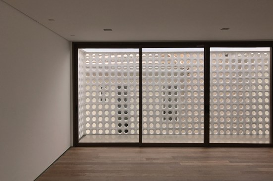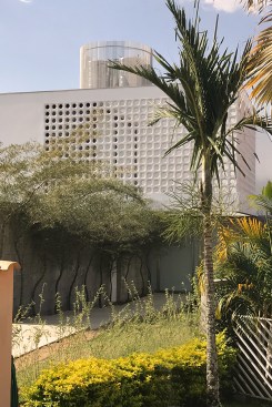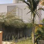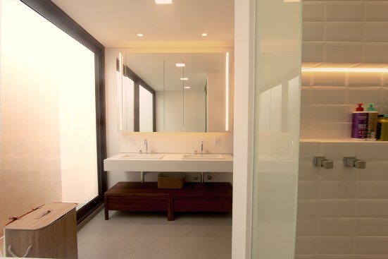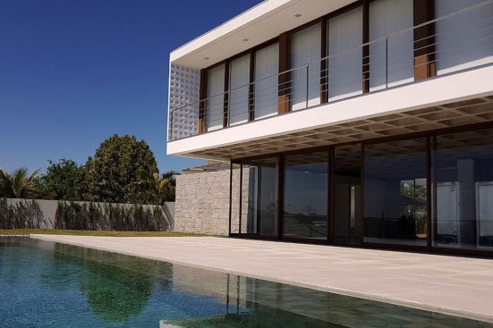 The upper floor consists in the private Family area: bedroom, bathrooms and home-theater. These spaces are made in structural mansory and covered with pre-frabricated concrete slab. The bathrooms open to internal small patios that provide natural lighting and ventilation. The upper floor façade is covered with void elements, called “cobogós” that protects from solar heating of the spaces and provide natural ventilation and privacy of use.