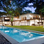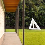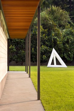 The sense of disjuncture that had pervaded the interior was also present at the existing yard. The architects opened up the backyard by aligning a new lap pool with the new sliding glass doors of the den. The installation of three different patio spaces takes advantage of the new layout. The backyard patio immediately off of the main house provides a space for lounging and sunbathing, a side patio off the living room offers a fountain and a place for quiet reflection, and a covered patio behind the garage features an outdoor cooking area, fireplace and projection screen. A Sol Lewitt sculpture, visible from the main rooms of the house, increases the depth of the yard and provides a crisp and geometric focal point.