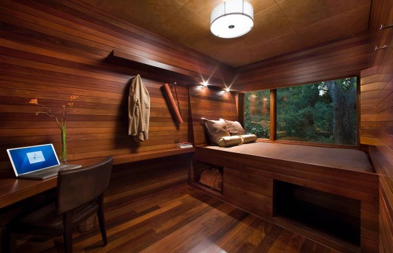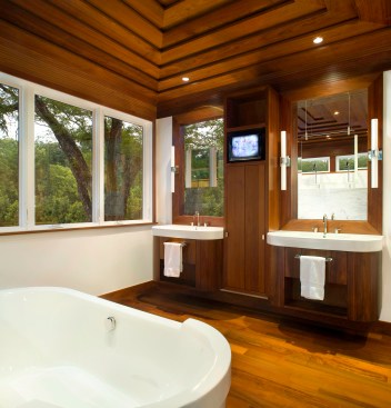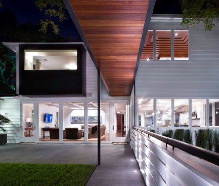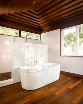 Painted white gypsum board walls are combined with several carefully selected materials used repeatedly throughout the house to achieve clean, balanced spaces that are not distracting. Ipe wood is used extensively on the interior and the exterior of the house, including the handrail at stairs, the ceiling and floors of the master bathroom, the paneling and cabinetry at the guest bedroom, and the pool trellis at the backyard patio. Stainless steel is the primary metal finish on the interior of the house, while soapstone and Carrera marble comprise the kitchen countertops, custom fireplace surround, and bathroom counters.