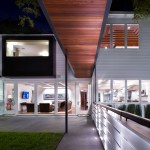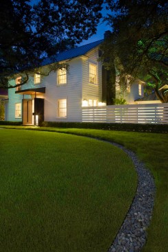 The material palette for the exterior of the house is simple as well. White painted wood-lap siding is the main material on the exterior of the house. The grey Kynar metal roof sets the standard for all other metal on the home’s exterior. Any exposed metal structure is painted to match, while the Kynar metal is used to wrap the chimney, the master bedroom window protrusion at the back of the house, the two sidewalls at the entry to the house, and the garage doors. Meanwhile, Pennsylvania bluestone is used extensively as the exterior paving material at the patios and for the pool coping.