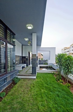 The house has been designed for a join family that consists of an IT couple with their young son and elderly parents. The 5 bedroom house with inner spaces separated by nature i.e. green courtyards, small water bodies and level differences makes it only one of its kind.