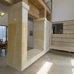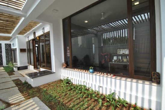 Lying on the outskirts of Chennai, the house harbors the sentiments of three women. A mother- daughter duo of bharatnatyam dancers and the fulfillment of the needs lead to the creation of a well designed traditional south Indian bungalow with relevance to the current day contemporary feel. The traditional form of an entrance gateway with thinnai on two sides, begins the ethnic feel of the house right at the entrance. The continuity of this feel accentuated by the use of rustic granite and rough traditional flooring. This leads to the main entry of the house. This is planted on both the sides and highlighted with a pebble mesh.
