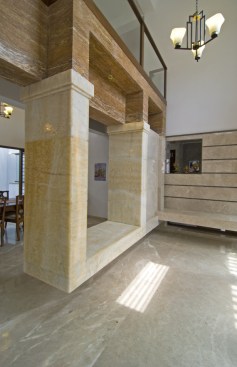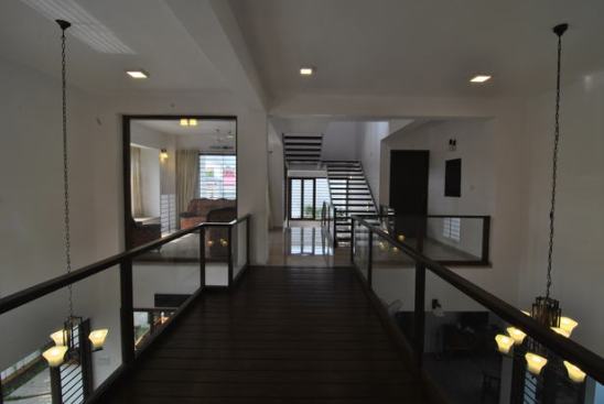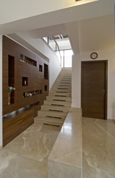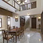 Multilevel planning of the spaces creates exciting feel indoors. There are a series of courtyards placed at different levels. Each of these courts allows the user to be part of nature even when indoors. The flow of spaces and merging of the indoor and outdoor elements are highlighted using glass partitions, etc. a wooden bridge, glass pavilion of the pooja room are some of the exciting interior aspects of the house.