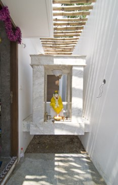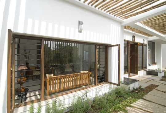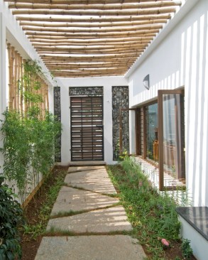 A long walkway was another feature which was evolved as a requirement of the eldest women of the house, the elder mom who loved to walks around the space. The walkway with bamboo clusters on both the sides and bamboo pergola above create an inviting feel all leading to the main door of the house.