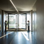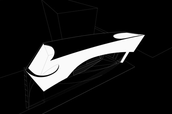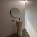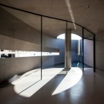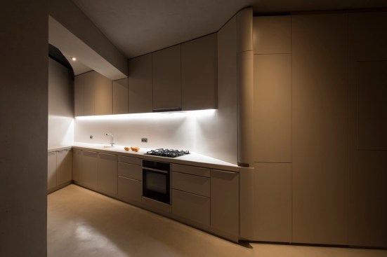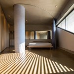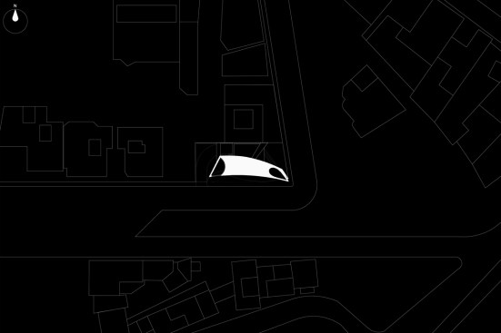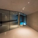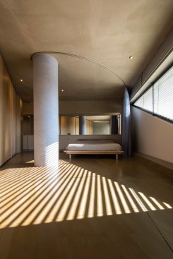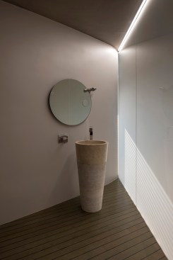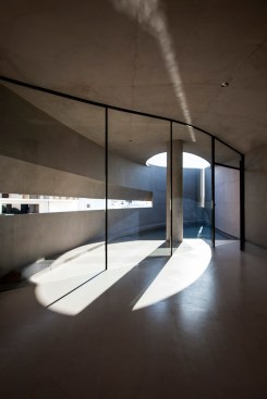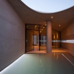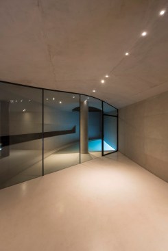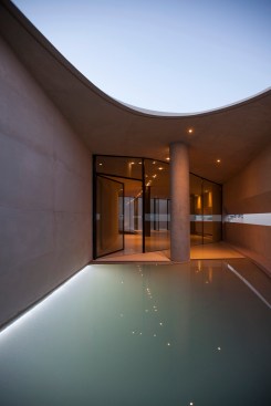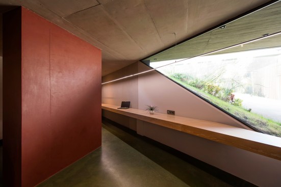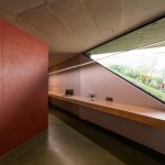 The structural design is inseparable from the form itself: the supporting at the garden’s level is progressively altering from a circular metallic column, to a square concrete one, in order to conclude to the corner monolithic wall upon which the façade rests freely. Its eastern vertical slot allows the thermal expansion and contraction. In the interior, the vertical blinds offer privacy and protect from the eastern light, passing their deep red color to its innermost recess. The monochromatic kitchen recedes to the west, while its perforated metallic shutter acts as a magnet of light during both day and night. The underground study area, as well as the staircase leading to it, are of dark green colour -a natural continuation of the exterior garden. In the parking space, a circular neon wreath around the central column is complementary to the car’s manually rotating ring. In the lighter upper floor instead, it is the glass pane frames that are curved following the vaulted roof. The metal column remains oxidized and dark -while the lighting spots run along its axis. The west facade remains blind, as well as the eastern one -concealing a liquid, receptive interior.