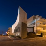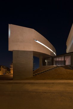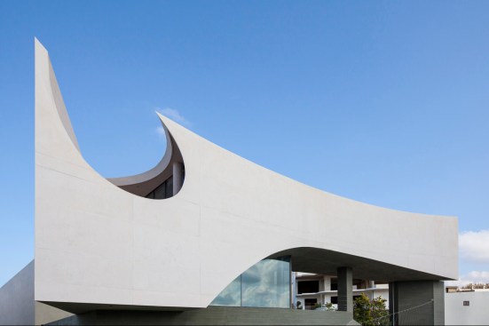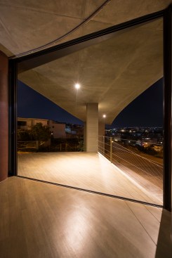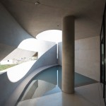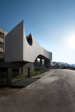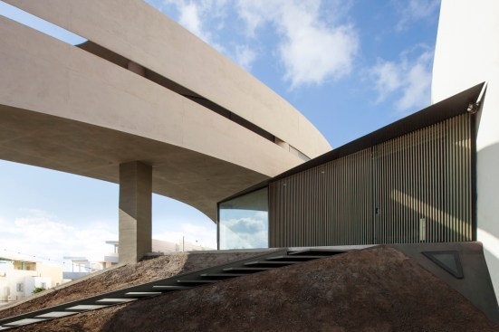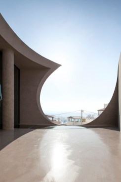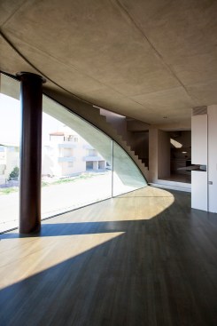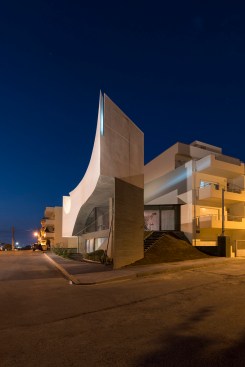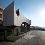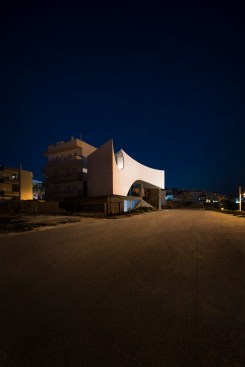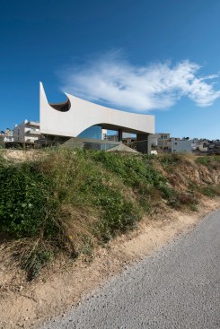 The house is born by its southern, extrovert, cretan field. From the outset, the sculptural gesture arises from this sunny condition: the building is bent by the sun. The elevated concrete facade is without openings, except from an excision at the upper corner which reveals an outdoor space open to western views of the city. The lower curve receives the light at the intermediate main level, incorporating the staircase to the upper floor. The volume acts not only as a receptor of the private upper premises of relaxation, but also as a shelter for the semi-open expansion of the residence and its garden. Its interior ends in a hidden excision of the roof, at the eastern corner. There, a small pool serves as an outdoor bath. The lower level which is developed as a rigid dark base is also introverted. The handling of curves in this work aims at a tense handling of void and light. Thus, a successive interpenetration of closed, semi-open and open-air spaces is created: The house is curved, twisted, excised, following the field’s forces -natural or urban. The essentially playful façade seems to enjoy the contrapuntal complicity of its neighboring mass-produced apartment blocks.