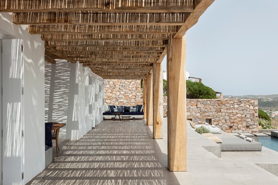 The outdoor area follows the topography of the landscape through a series of steps that define the outdoor areas and of-fer vast relaxation spaces, sheltered either from the sun or from open. The house and guestroom in-between space under the roof slab is designed as the heart of a summerhouse: a place near the hearth where all residents will relax and enjoy the Aegean.