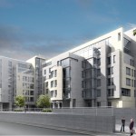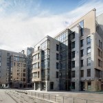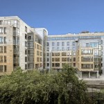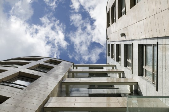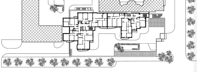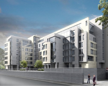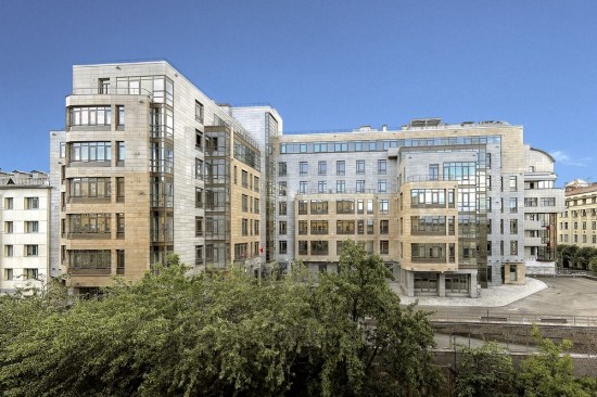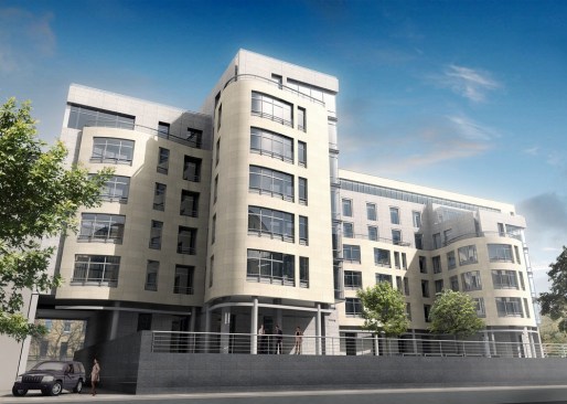 The two-section building of U-shaped form is located on the platform of the semi-buried closed parking. The main facades accents are the glazed surfaces of overhanging parts of the building and the cascade of terraces. On the ground floor there are the office rooms blocks, the residential accommodation is arranged from the second floor, and there are technical rooms and a parking on the basement floor.