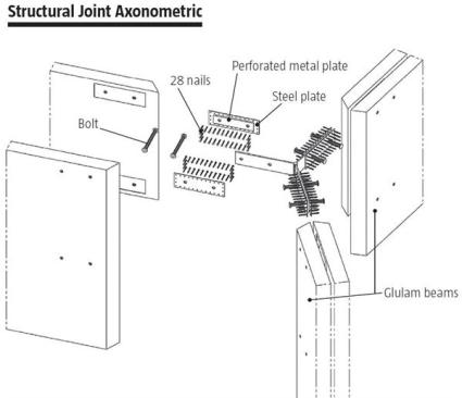 Each cell comprises four or five boards, laid on end and secured with a series of screws to a triple-flanged steel element at the vertex of each angle. The only adhesives used during the construction process were ecologically friendly glues. The cells serve a variety of functions: Some accommodate skylights, some house direct downlights; others filter indirect artificial light through a 3-inch-thick aluminum grating; and still others incorporate a perforated wood screen that masks acoustical felt.