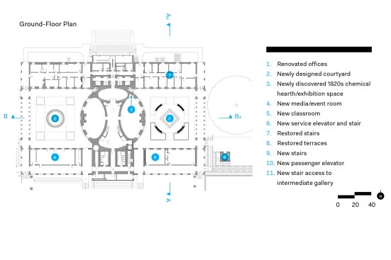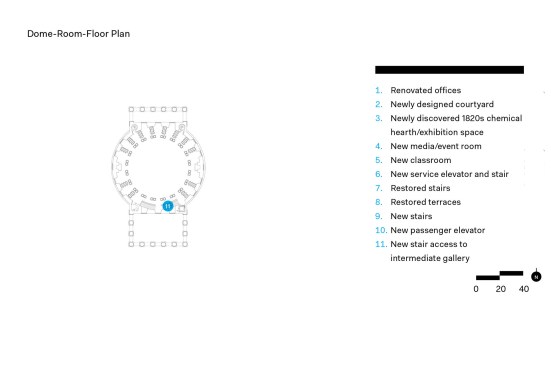 Inside, the architects restored Jefferson’s volumes, finishes, and architectural details on all three floors. In the dome room, acoustic plaster replaced the perforated aluminum ceiling while cast plaster column capitals from the 1970s were replaced by ones of carved wood, again echoing Jefferson’s original intent. The project’s least noticed but perhaps most important element is the construction of a new mechanical, service, and storage space contained in a vault that was excavated beneath the east courtyard.