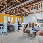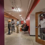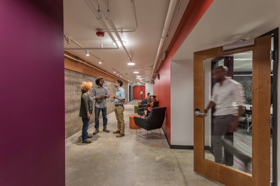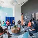 With so many diverse groups to serve—and a tight budget to work with—the team turned to inexpensive yet effective strategies, such as bright paint colors, for creating different identities in the shared space.