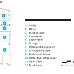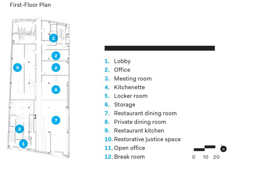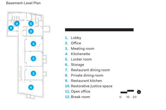 The ground floor of the gut-renovated building is largely occupied by Colors—a ROCU-operated restaurant that hosts job training and placement programs for low-income women and people of color. Shared office and meeting spaces in the basement serve several nonprofits, while the second floor holds the offices of the Ella Baker Center as well as dedicated space for Alameda County’s restorative justice program.