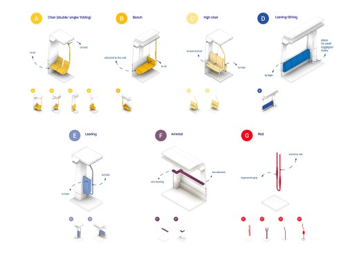 In the new metro interior, every square centimetre is used to create as much space for travellers as possible. Mecanoo researched all kinds of variants for standing, supporting, leaning and sitting, which increases the variety in types of positions passengers can travel. This resulted in five modules of low and high chairs, benches, leaning elements and armrests that facilitate all possible sitting and standing positions.