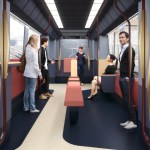 Coloured areas in the floor indicate where passengers can stay and which parts are intended for movement through the vehicles. Colour nuances in the furniture create a dynamic and vibrant interior, but also subtly reflect the different seating and reclining elements. Floors, walls and ceilings enter into a strong relationship with each other and form a rich basis in tone-on-tone grey-blue colours and various textures.