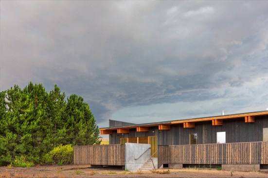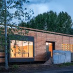 Inspired by the constraint of using locally sourced forest product, a straightforward conceptual approach was developed: a wood box, raised off of the ground plane screened with a modern interpretation of the western storefront. The Nursery Sales Office cantilevers out beyond the screen as the public element of the project. Stairs and a ramp reach out to the landscape leading to the entry which contains the social gathering space, with fireplace and kitchen. The classroom is located to the west. A 12’-0” sliding door connects the classroom to the social space. A large deck overlooks the nursery operations to the south. Faculty offices line the south wall. The interior is clad with veneered wood panels, each wood species highlighting a particular Idaho wood species. The custom designed windows frame views to the nursery operations and Palouse.