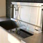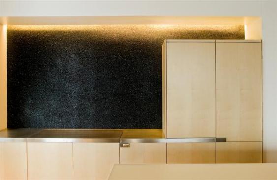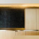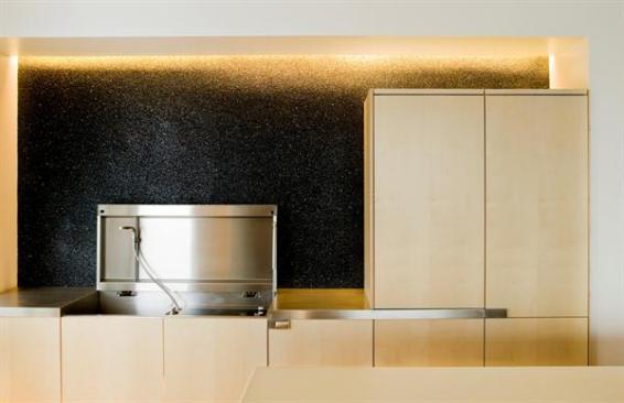 The multipurpose island, for example, conceals four custom stools with backs that mimic file cabinets. Push the stools in and the island morphs from conference table to sleek, stand-up bar. Along the room’s textured stone wall, a flip-up section of stainless steel counter reveals a recessed sink and cooktop. That same countertop flows seamlessly into handles for cabinets containing the fridge and other built-in appliances.