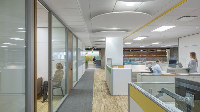 To address well-being for employees, in addition to more natural light, there are walking desks, quiet rooms, sit/stand desks at every workspace and printers placed strategically in the corners of each floor to encourage movement throughout the day.