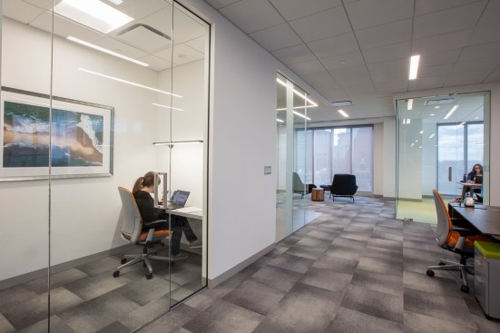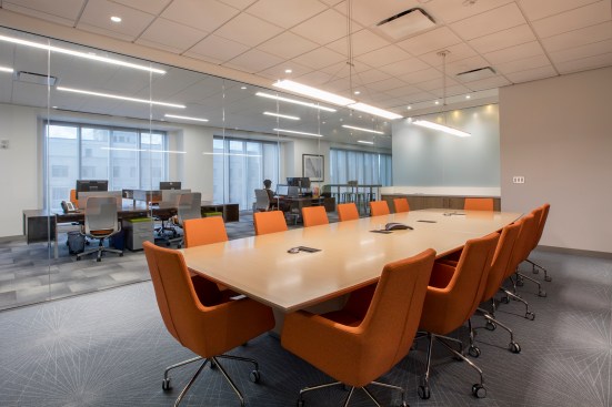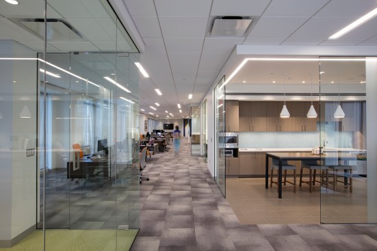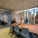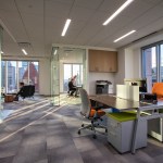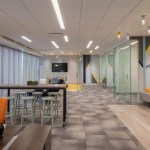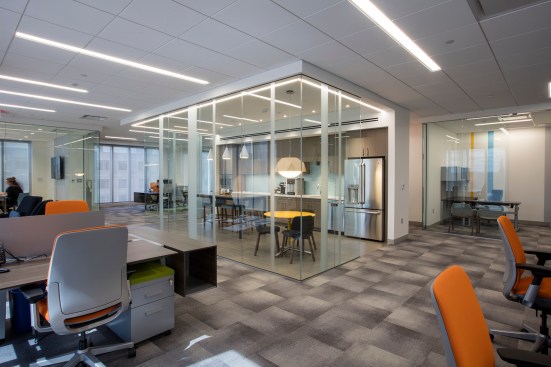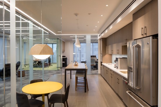 The major design challenge of this gut renovation was to achieve a flexible workplace that would allow for continued growth. Planning strategies called for a balance between private offices and an open plan with modular workstations. Private offices featuring glass fronts for transparency were located along the interior walls, creating large open areas for workstations, and allowing natural light to penetrate deep within. Modular workstations and lounge areas support the clients’ collaborative culture, and an open kitchen serves as the nexus of the office; a social hub, collaboration zone and informal gathering space for touchdown meetings. The design features painted murals that were a cost-effective way to create an identity for the office, while also tying together the interior of warm yellow and shades of blue and gray. Interior finishes feature reclaimed wood, stainless steel, glass and Italian porcelain. Furniture also played an important role in the color palette, adding pops of green, orange, yellow, and light blue.