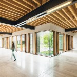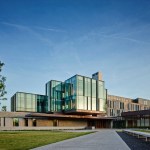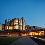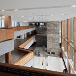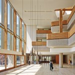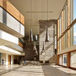 Echoing the architecture of Western University’s campus, a full height great hall anchors the main circulation, with the dining hall, library and amphitheatre extending into the surrounding landscape as distinct pavilions. Designing from the inside out, the architects created spaces that support Ivey’s unique case-based and team learning pedagogy. The research-based design process involved numerous workshops and a survey of 60 top business schools. The building’s materials—stone, concrete, glass, copper, steel, walnut, and Douglas fir—were selected for their elemental and timeless qualities. Innovative site strategies and embedded technologies were employed to achieve a sustainable design.