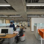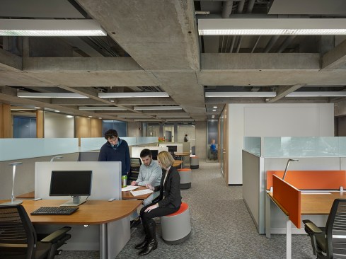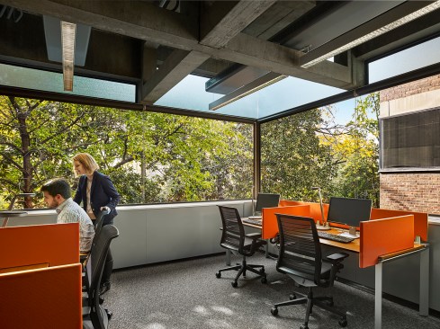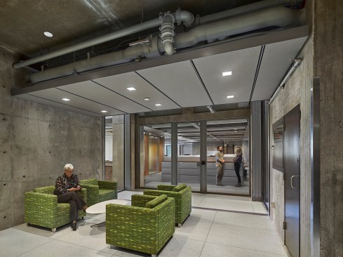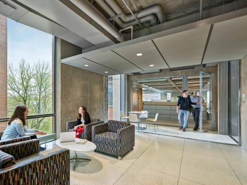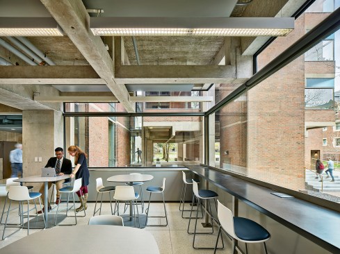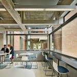 Closely following preservation guidelines, AOS adapted research spaces for five individual user groups, each with specific spatial needs and technology requirements. The renovation removed layers of existing finishes to express and feature the building’s original concrete truss construction, and all new mechanical and electrical systems were carefully integrated to respect Kahn’s original design. Phase 2 of the project received LEED CI Silver certification, and Phase 3 received LEED CI Gold certification.