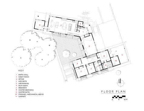 Internally focused, two shed-roofed bars are joined to create a private courtyard adjacent to a mature stand of live oaks. A perpendicular bar serves as a play space for the owners’ 3 active boys, with a wood “stage” at the south end to mediate the grade change, and the entry resolving the “knuckle” at the north. With multi-functional rooms that integrate circulation, the house lives much larger than its modest 2400sf.
