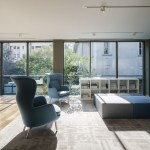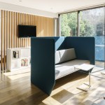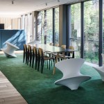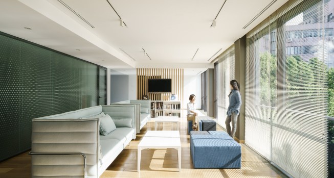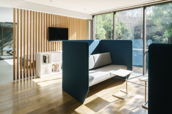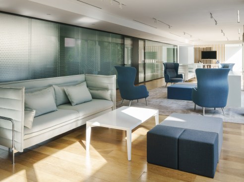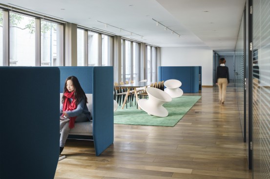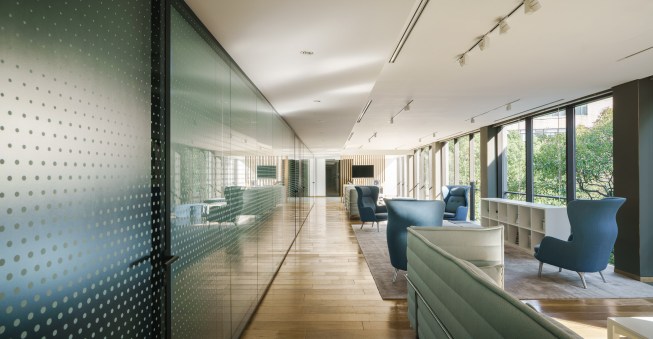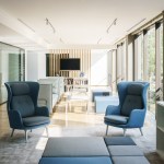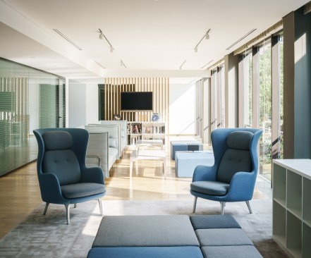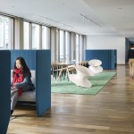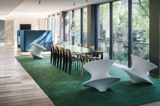 The second floor gives forth instant youthfulness and vitality. Fun Spun Seats from Magis and a communal table are placed in the center of the lounge area, matching with vivid grass green rug. On each side of the central area, blue high-back sofas by Buzzi Space are installed, which can function as informal meeting space. People can easily come together and share information with privacy.