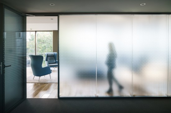 The third floor is elegant in style with innovative contemporary furniture. In the lounge area, the designer mixed Ro chair from Fritz Hansen, Alcove sofa from Vitra and fabric surfaced stools to create a flexible meeting, reading and relaxation space. Training classrooms are located beyond the glass partition. The translucent dotted glass adds vibrancy and provides privacy. Each classroom is separated by removable walls which are sound proof. The removable walls also gives the whole space flexibility for other events. Atthe end of the lounge, there are computer area and a long white communal table serving as work station or dining area.