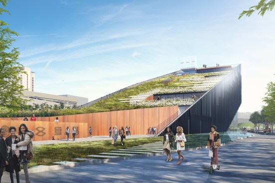 The resulting pavilion erupts from the ground, its form “based on this idea of unearthing buried history, buried truths,” says principal Dayton Schroeter, AIA. The façade uses the iconography of stripes—which recall the American flag and “the uniforms of Black men on chain gangs during Reconstruction, physical jails, and even the rows of cotton of Antebellum slavery, in which African labor was exploited,” he says. Inside are interpretive galleries, community spaces, and places for quiet reflection, all under a green roof that references, among other things, the gardens cultivated by African American healers. “Often we talk about this history as Black history, but it is American history,” Schroeter says. “It’s an opportunity to preserve a rare artifact and create a comprehensive learning experience around it.”
