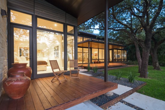 Our clients, approaching retirement and relocating from Houston to Austin, purchased this site high on a ridge overlooking Lake Austin and the Pennybacker Bridge. The property came with a house which proved inadequate for their needs but which nestled neatly amid beautiful live oaks. In choosing to commission a new home, they asked that it also tuck under the limbs of the oaks and maintain a subdued presence to the street. Extraordinary efforts such as cantilevered floors and even bridging over critical root zones allow the design to be truly fitted to the site and to coexist with the trees, the grandest of which is the focal point of the entry courtyard. Of equal importance to the trees and view was to provide, conversely, for walls to display a collection of 35 School of Paris paintings and numerous books. From form to smallest detail, the house is quiet and subtle.