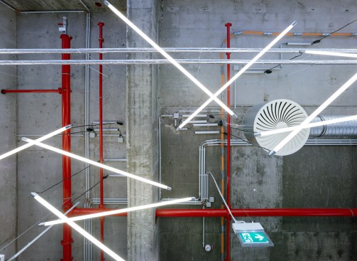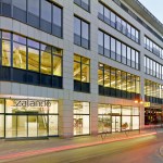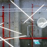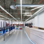 The online clothing retailer Zalando enlisted 1100 Architect to design a new flagship outlet store in Frankfurt am Main, adding to their brick and mortar presence in Germany. The interior of this former department store was stripped down, resulting in an untreated exposed concrete ceiling and seamless industrial flooring that together form a minimalist loft-like environment for the company’s collection of clothing, shoes, and accessories. A linear light system accentuates the building’s structure, while stained plywood shelving and suspended black steel clothing rods reinforce the industrial aesthetic. The minimal interior is balanced by wood furniture, felt curtains, and occasional accents in the eye-catching orange that has become a Zalando trademark.