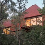 With its hut-shaped forms and rational division of functions, Lake|Flato’s design is vaguely reminiscent of Louis Kahn’s early work, reinterpreted in a rustic accent perfectly attuned to East Texas and its pioneer history. Comprising four discrete structures arrayed on a hillside site, the project divides the program between the steeply gabled, pavilion-like volumes (living and dining; kitchen; sleeping quarters; garage), each sheathed in a textured envelope of steel siding. Clustered seemingly at random, the arrangement of the individual sub-houses is in fact carefully calibrated, visually masking them behind the tree line while capturing prevailing winds and thus reducing the need for artificial climate control. Inside each of them, elegant, wood-clad interiors are set aglow courtesy of skylights located high in the pitched roofs. Meanwhile, black-framed glass enclosures add a note of sophistication and wide-open welcome, allowing the whole ensemble to gleam invitingly at night—a tiny, hospitable village cast in the dark forest.