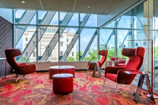 Two years after the completion of the Shaw Center for the Arts, the City of Baton Rouge engaged us to design a new downtown branch library. Located one block from the Shaw, the River Center Library creates a new model for library services for the City. In addition to traditional collections, it provides meeting rooms for community programming, outreach and creative collaboration; themed media walls, art walls, interactive kiosks, and conference rooms equipped with remote distance learning technology; a café; media/tech lab; business pods; a foundation and grants center; a maker room; a dedicated teen programming/gaming space, and a recording studio.