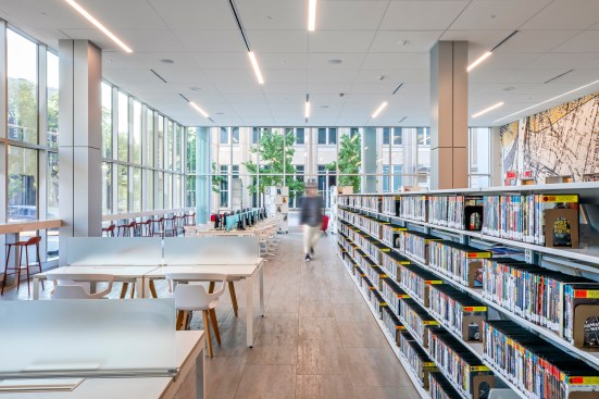 The flexibly designed interiors allowed the building to open successfully during the COVID-19 pandemic, requiring only moderate adjustments to meet requirements for physical distancing. Even with public health restrictions, the new library is providing the community with access to diverse forms of media and other essential services, and serves as a vibrant community hub.