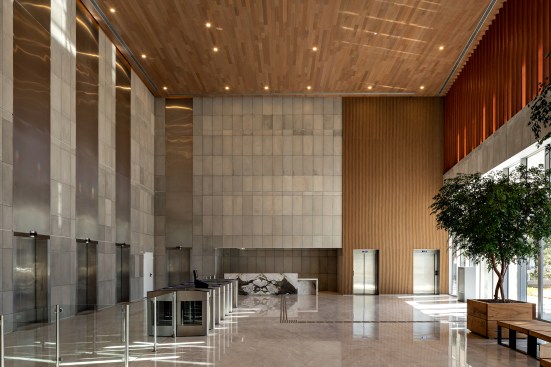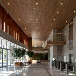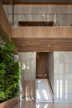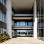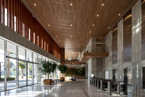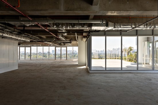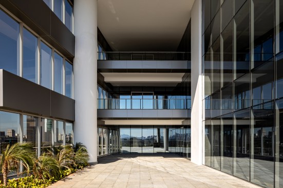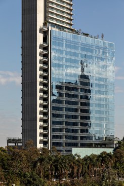 The gain in area (non-computable) amounted to more than 13 thousand sqm, about 20% of the project. For the beginning of the works, an area of 12,000 m² was demolished, a record in the city of São Paulo, through a sustainable demolition process. The green mass of the lot was preserved to integrate the exterior to the interior of the building. With a wide front facing the Marginal Pinheiros, the land has a double corner configuration. Commercial areas and an open square surround the two entrance halls – one corporate and one commercial.