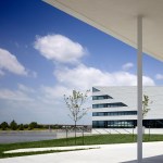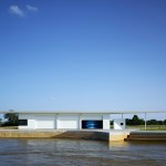 Exterior Skin: The corrugated white aluminum shingle reflects light and shimmers as if it is a liquid skin. The shingle is also used on the visible sloped roof of the main building, the sloped roof of the kayak building, and mechanical enclosure fencing. High performance glass matches the color and opacity of the other Boathouse District buildings.